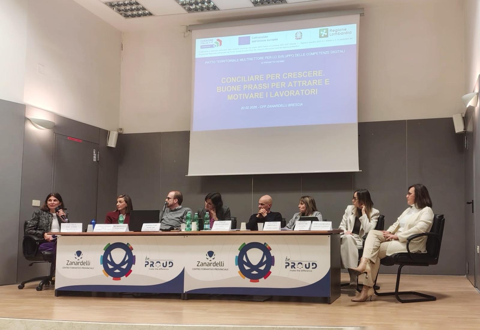 Si è svolto venerdì 20 febbraio, con successo e grande partecipazione, presso l’Aula Magna del CFP Zanardelli l’evento “Conciliare per crescere – Buone prassi per attrarre e motivare i lavoratori”, promosso dalla Provincia di Brescia insieme agli enti partner e la rete di supporto nell’ambito del Patto territoriale multisettore per lo sviluppo delle competenze digitali – ID 5423683, iniziativa di Regione Lombardia finalizzata a rafforzare le competenze e la competitività del territorio.