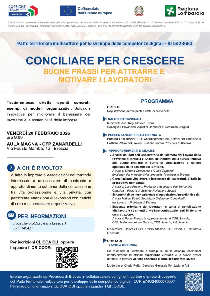 Venerdì 20 febbraio, alle ore 9.00 presso l’Aula Magna del CFP Zanardelli – Via F. Gamba 12, Brescia – si terrà l’evento “Conciliare per crescere. Buone prassi per attrarre e motivare i lavoratori”.